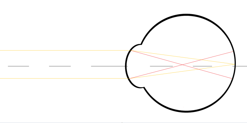 Na zdjęciu przedstawiono żółtą linią jak światło powinno skupiać się na siatkówce, z kolei czerwoną zaznaczono jak światło skupia się przed siatkówką (wtedy siatkówka odbiera obraz rozmazany)- co ma miejsce przy krótkowzroczności.