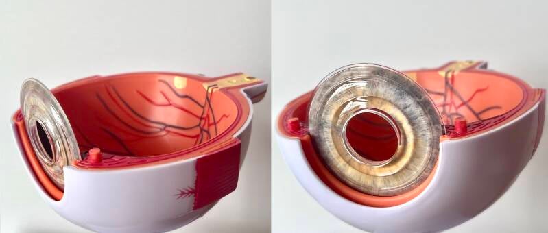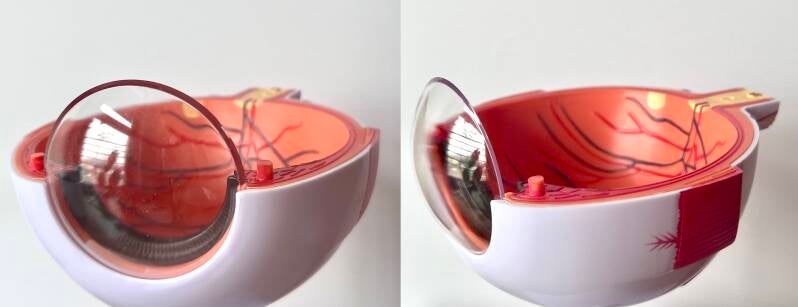 Soczewka znajduje się tuż za tęczówką i jest odpowiedzialna za wyraźne widzenie zarówno obiektów blisko, jak i daleko. Jest to możliwe dzięki temu, że zawieszona jest ona na mięśniach rzęskowych (na zdjęciu poniżej to te czarne coś pod soczewką 😉). Mięśnie te powodują, że soczewka jest albo wypłaszczona (widzimy wyraźnie na dal) albo wypukła (widzimy wyraźnie na bliż). Taką pracę mięśni i soczewki nazywamy akomodacją. Soczewka jest przeźroczysta dzięki czemu światło przechodzi dalej w głąb oka.