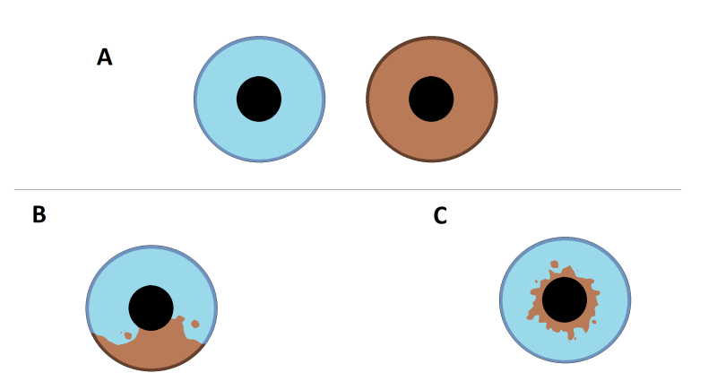 Heterochromia sektorowa (B) – tęczówka jednego oka ma dwie różne barwy, np. połowa tęczówki jest zielona, a druga połowa brązowa.