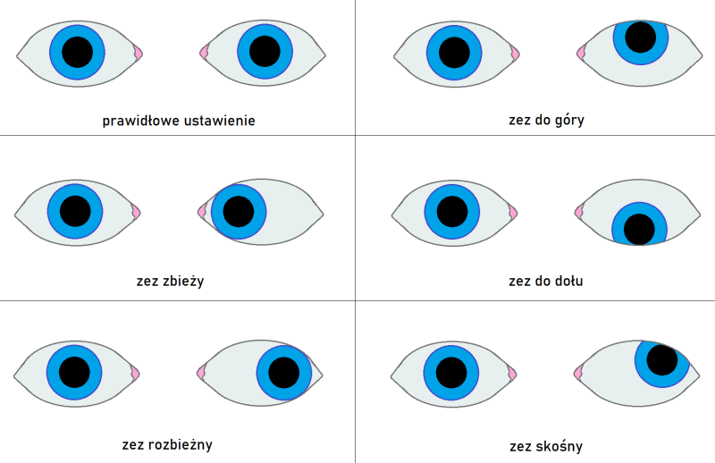 Zez jawny to widoczne ustawienie jednego lub obu oczu w innym kierunku niż powinny patrzeć (a powinny patrzeć na wprost, w ten sam punkt😀 ). Przy zezie jedno oko „ucieka” do środka, na zewnątrz, do góry lub do dołu.